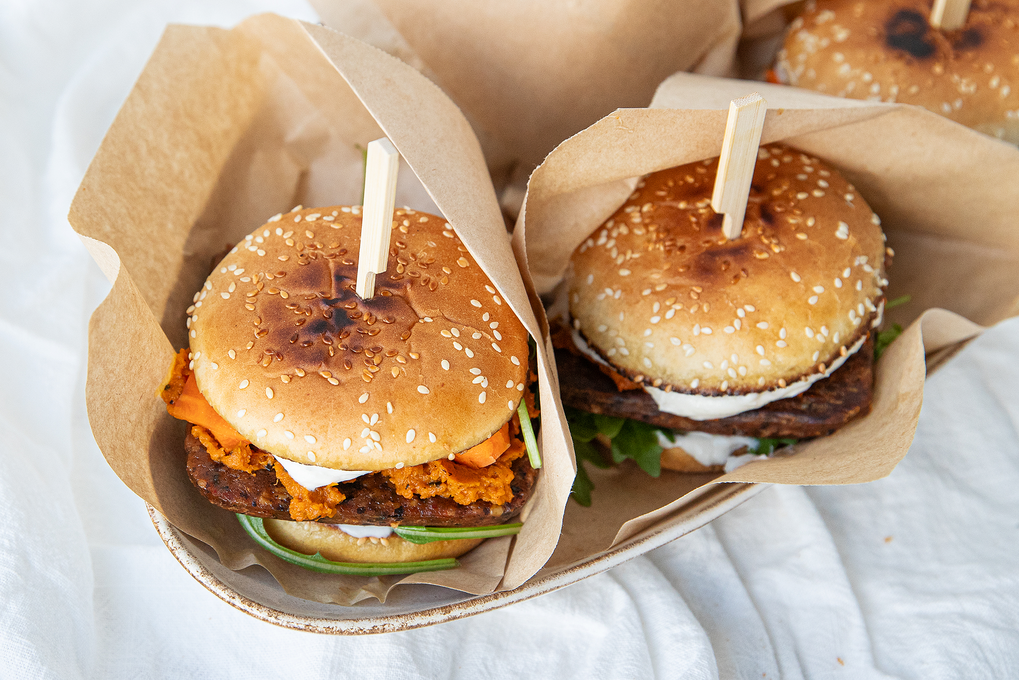 Montera hamburgaren (bröd, fetaostkräm, rucola, Stacky, morotskräm, inlagda morötter, fetaostkräm) och njut!