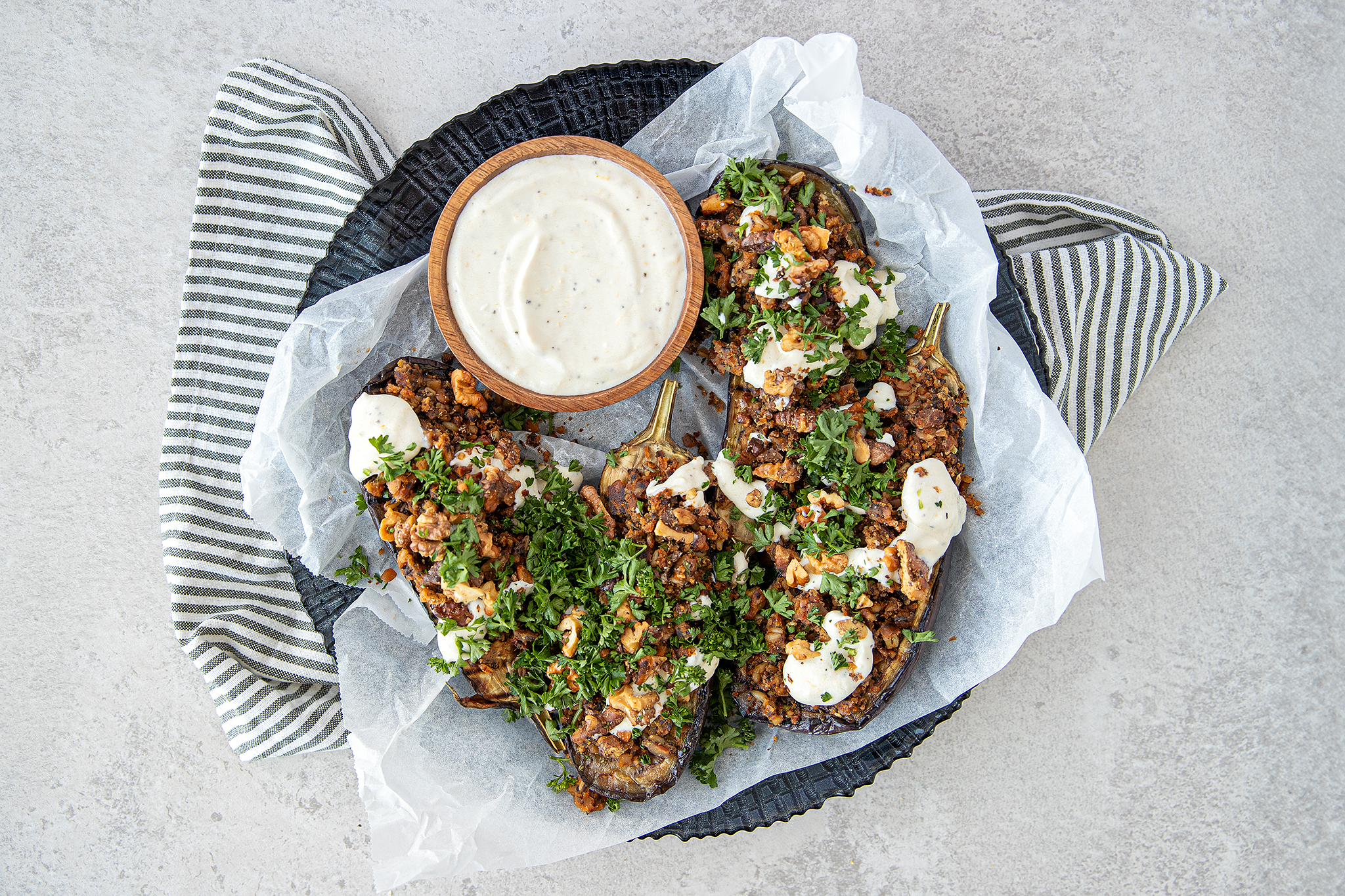 Servera den grillade auberginen toppad med Stacky’s, yoghurtsås, valnötscrunch och hackad persilja.