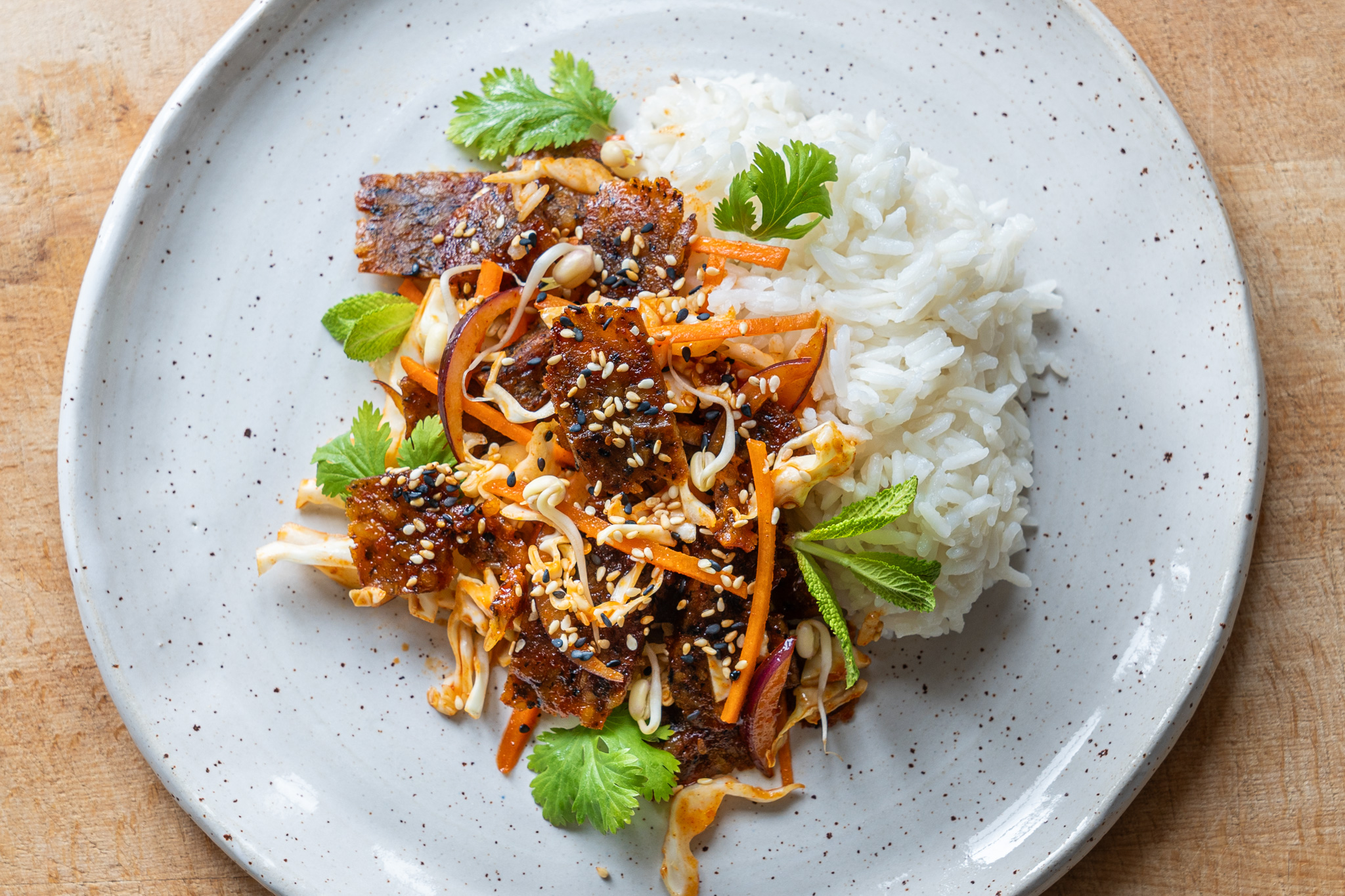 Servera med rostade sesamfrön, kokt ris och koriander.